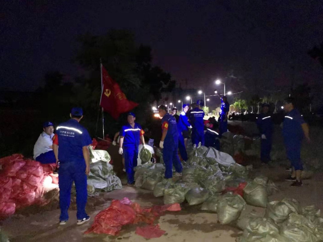 2021年7月28日下午2時,銀金達抗洪救災志愿者奔赴七里鋪至衛共橋筑壩現場,參加修筑攔洪堤壩,一直戰斗到深夜九時。